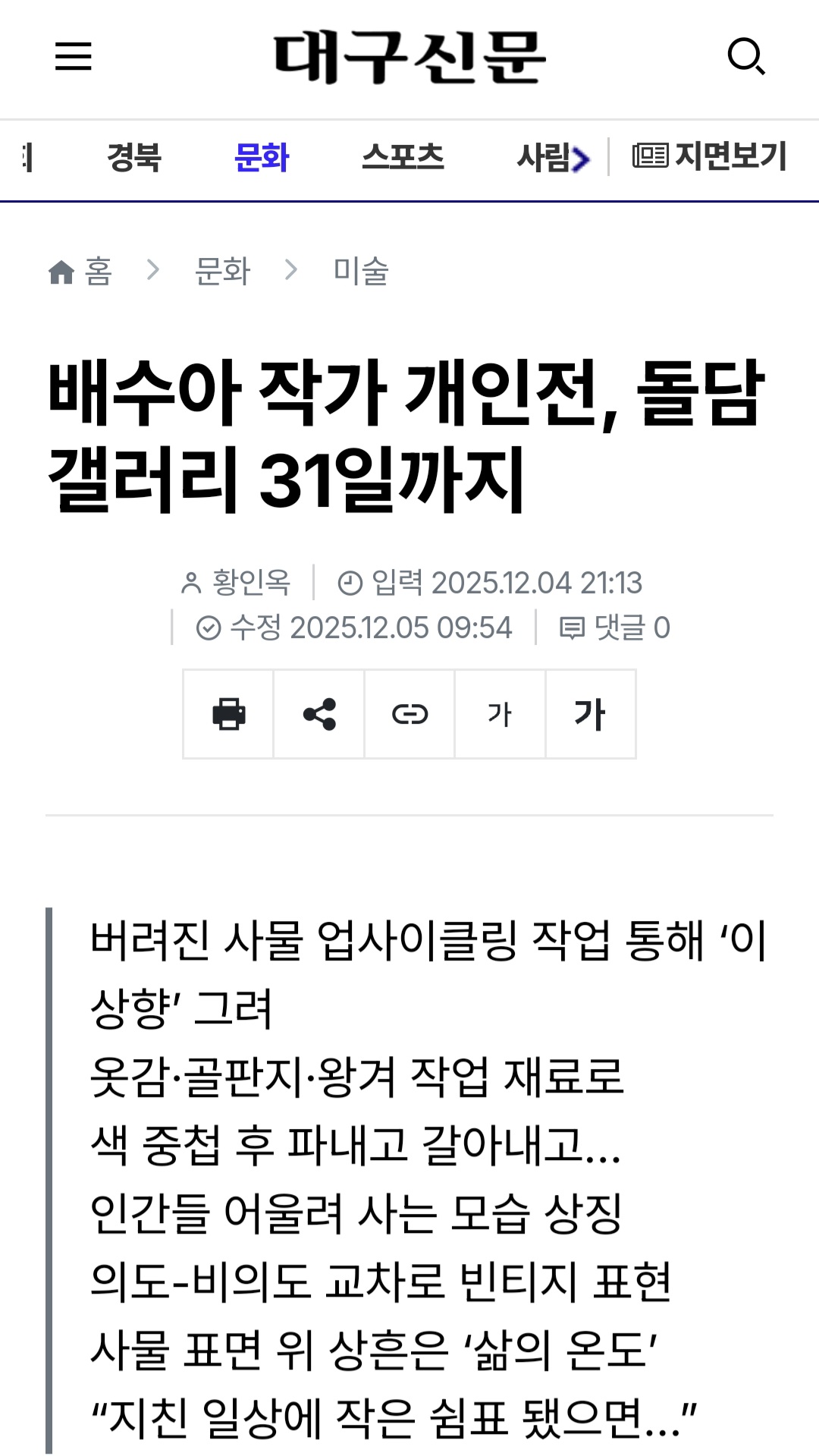 ●배수아 작가 개인전, 돌담갤러리 29일까지 - 대구신문