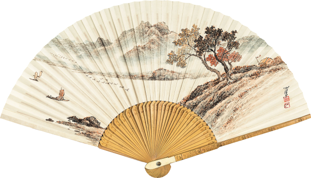 근경의 언덕은 담황색과 옅은 먹 점을 농담으로 중첩해 듬직한 덩어리 감을 나타냈고, 원산의 산봉우리와 그 아래 강안도 형태감이 단단하다. 단풍 든 나무가 강을 향해 쓰러질 듯 비스듬한 것은 반원형인 부채꼴 화폭에 맞추어 구심성이 강한 구도를 취했기 때문이다.