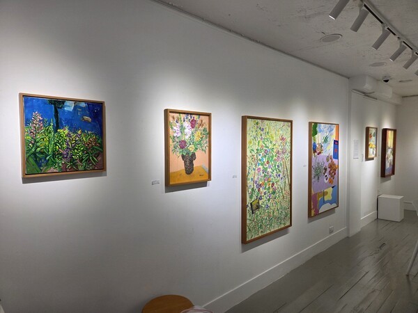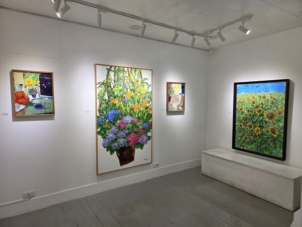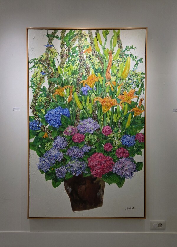 특히 화면을 감싸는 유연한 선들은 감정의 흐름을 따라 자유롭게 이어지며, 생명력과 리듬을 강조한다. 흰 배경 위에 펼쳐진 꽃부케 연작은 초록의 줄기들이 수직으로 상승하는 듯한 생동감을 통해 여름 화단의 풍요로움과 기쁨을 담아낸다. 이는 자연의 에너지와 일상의 활력을 동시에 상징한다.