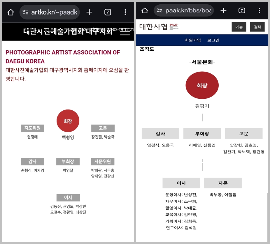 대구지회 조직도를 보면, 조언자(9명)가 실무자(8명)보다 많아 실제 일을 추진함에 간섭이나 승인 절차가 번거롭다. 이사진도 분담금 충당 보다는 분야별 전문성 이사로 개편해야 할 것이다. *전략이사 / 기획 예산, *교육이사 / 교육 이론, *미디어이사 / 전시 촬영 / *대외협력이사 / 회원 네트워킹 으로.