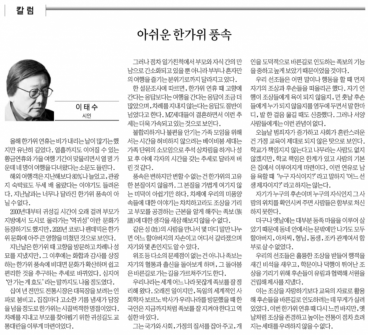 풍속은 변하지만 변할 수 없는 건 한가위의 고유한 본질이지 않을까. 그 본질을 가볍게 여기지 않는 미덕이 아쉽기만 하다. 차제에 우리의 미풍양속들에 대한 이야기는 차치하고라도 조상을 기리고 부모를 공경하는 근본을 알게 해주는 족보(族譜)에 대한 생각을 새삼 해보지 않을 수 없다.