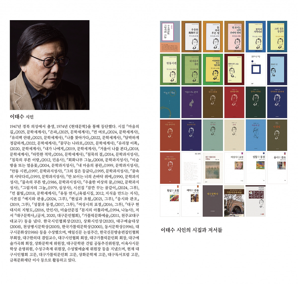 이 전시는 대구문단의 큰 어른으로 불리는 이태수 시인이 1974년 《현대문학》으로 등단한 이래 51년 동안 펼쳐온 시적 여정 전체를 압축적으로 보여주는 최초의 대규모 회고전이다.