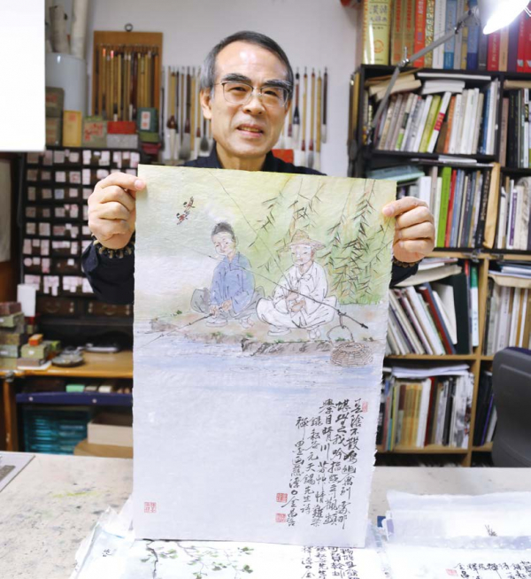 <운곡시사>에 담긴 이야기를 그림으로 표현한 담원 김창배 화백이 작품을 들고 미소짓고 있다.