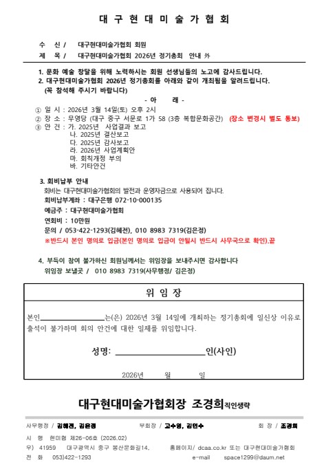 2. 대구현대미술가협회 2026년 정기총회를 아래와 같이 개최됨을 알려드립니다.