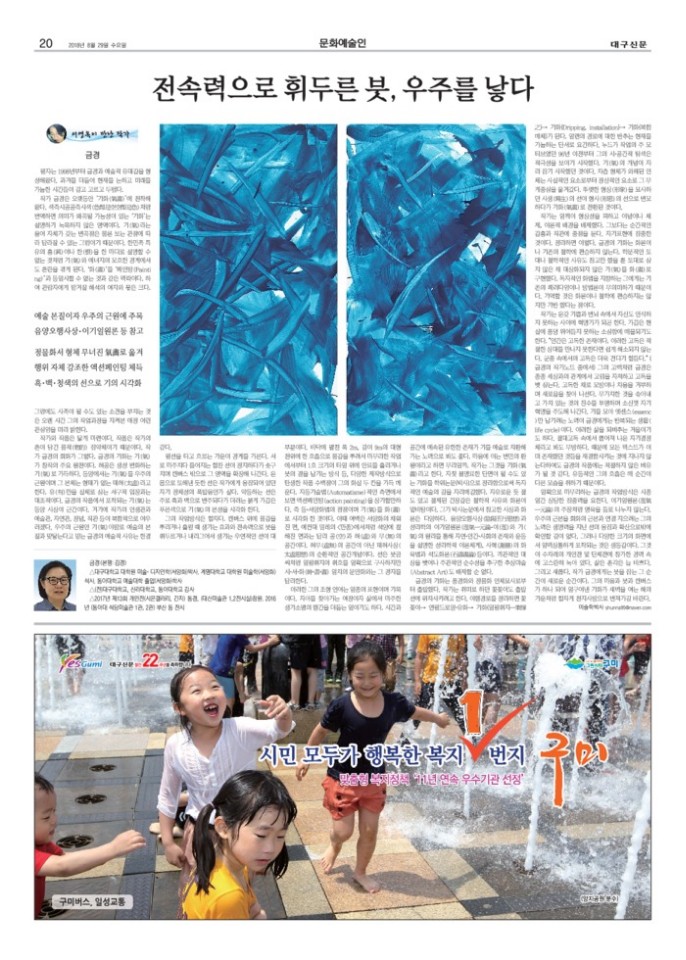 작가 금경은 오랫동안 ‘기화(氣畵)’에 천착해왔다. 색즉시공공즉시색(色卽是空空卽是色)처럼 번역하면 의미가 왜곡될 가능성이 있는 ‘기화’는 설명하기 녹록하지 않은 영역이다. 기(氣)라는 용어 자체가 갖는 변곡점은 물론 보는 관점에 따라 달라질 수 있는 그림이기 때문이다. 한민족 특유의 흥(興)이나 한(恨)을 한 마디로 설명할 수 없는 것처럼 기(氣)와 에너지의 모호한 경계에서도 혼란을 겪게 된다. ‘화(畵)’를 ‘페인팅(Painting)’과 동일시할 수 없는 것과 같은 맥락이다. 하여 관람자에게 맡겨질 해석의 여지와 몫은 크다. 그럼에도 사족이 될 수도 있는 소견을 부치는 것은 오랜 시간 그의 작업과정을 지켜본 애정 어린 관심임을 미리 밝힌다.