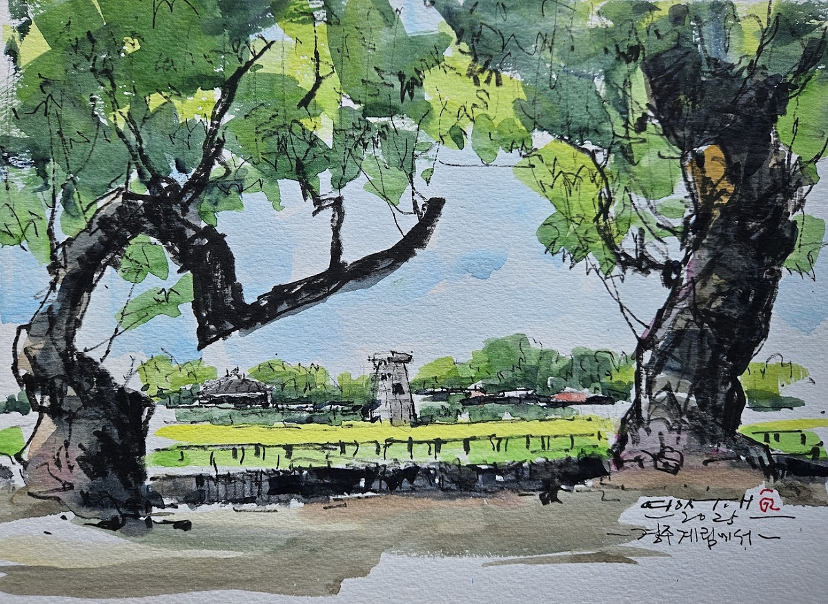 어반스케치여행/경주계림/종이에유성펜수채/8절/2025-일운한영수사생회 현장15분시범작