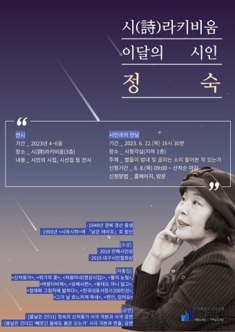 정숙 선생님은 시집 『신처용가』, 『위기의 꽃』, 『바람다비제』 등. 처용·단오굿·계정 숲 등 자인 지역의 신화·민속을 현대 시로 풀어낸 연작시로 유명한 시인으로 지역 시단 형성기로 자인 신화와 향토를 노래한 지역 여성 시인으로 자인 지역의 신화·민속·지형을 시로 재구성해, 경산을 배경으로 한 여성 서정시 세계를 구축한 선생님은 고향 자인의 신화·풍광을 시로 정리한 ‘지역 시단의 얼굴’의 위치이다.