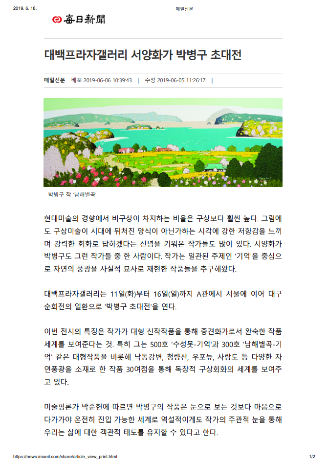 대백프라자갤러리는 11일(화)부터 16일(일)까지 A관에서 서울에 이어 대구 순회전의 일환으로 '박병구 초대전'을 연다.