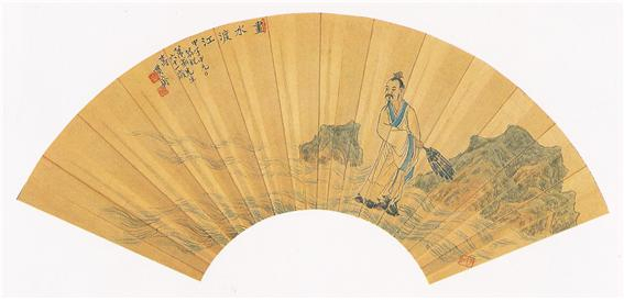 예스러운 차림의 한 인물이 넘실거리는 물결 위에(!) 서 있어 얼핏 보면 신선도나 고사도(故事圖)처럼 보인다. 부채에 그리면서 그림 속 주인공도 깃털 부채를 든 재미있는 그림이다. 근대기 한국화가 이도영의 작품으로 '획수도강(畫水渡江)'으로 제목을 써넣었다. 제목 옆에 써넣은 글은 이렇다.