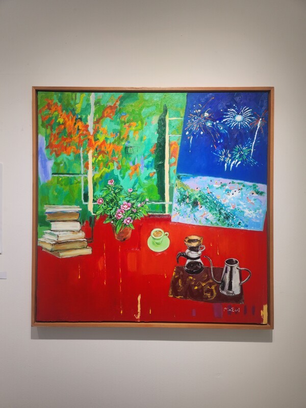 또한 실내 장면에 반복적으로 등장하는 ‘창’의 모티프는 물리적 경계를 넘어서는 상징적 장치로 작용한다. 창은 내면의 질서와 외부 세계의 경험을 연결하는 통로이자, 확장과 소통의 의미를 담는다. 이를 통해 작가는 안정과 자유라는 상반된 감각을 한 화면 안에서 공존시키며, 인간의 내면과 외부 세계 사이의 긴장을 시각화한다.