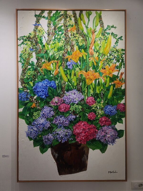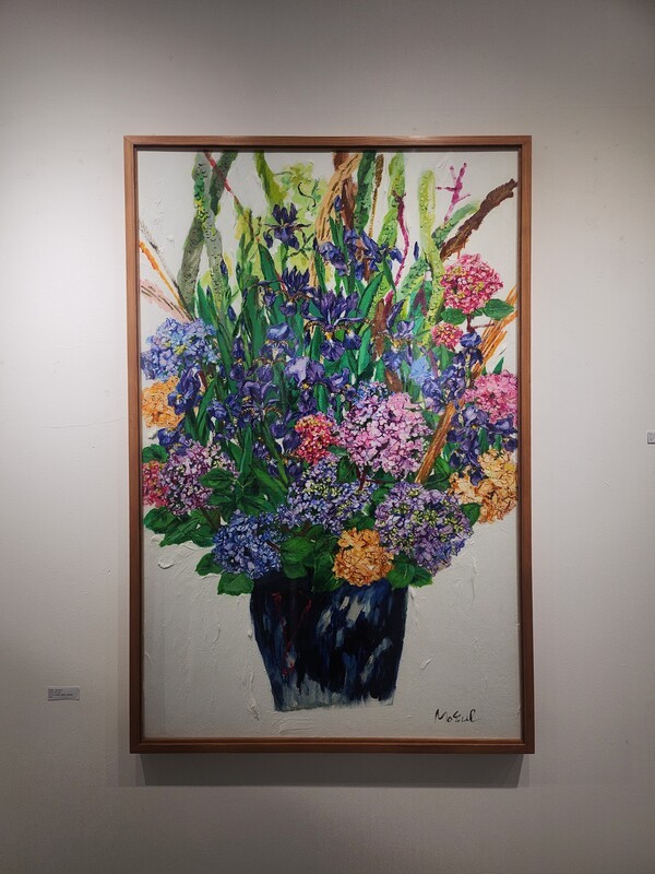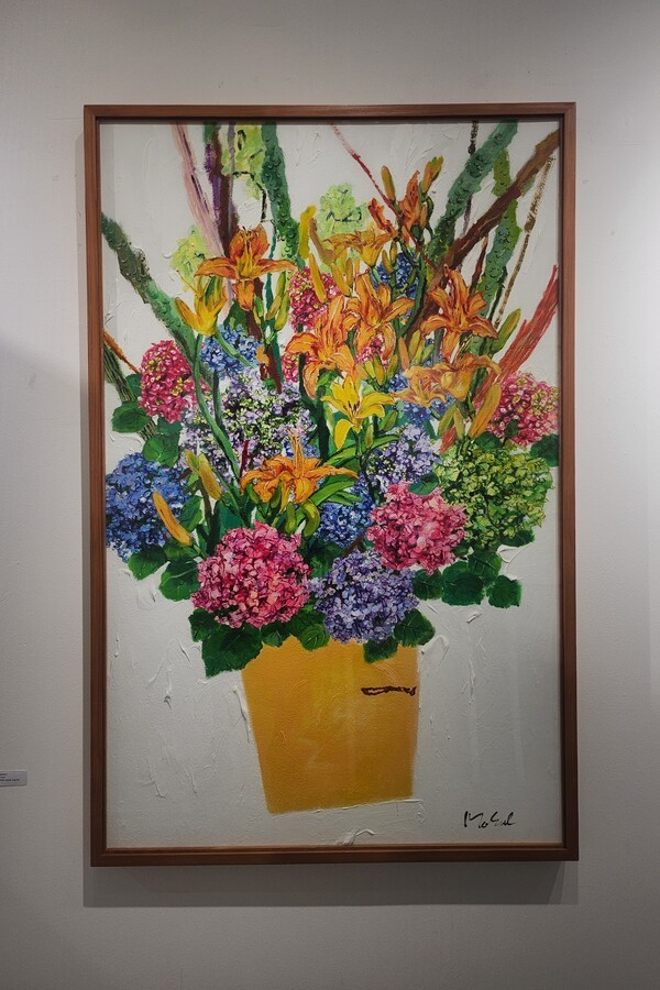 특히 화면을 감싸는 유연한 선들은 감정의 흐름을 따라 자유롭게 이어지며, 생명력과 리듬을 강조한다. 흰 배경 위에 펼쳐진 꽃부케 연작은 초록의 줄기들이 수직으로 상승하는 듯한 생동감을 통해 여름 화단의 풍요로움과 기쁨을 담아낸다. 이는 자연의 에너지와 일상의 활력을 동시에 상징한다.