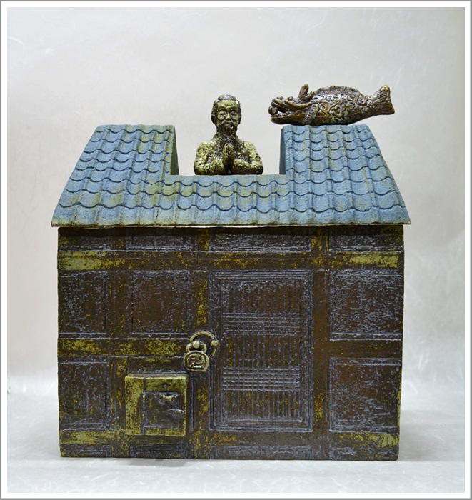 무일우학 대선사의 천일청정결사 중 하루 한끼로 폐쇠된 무문관 작은공간에서 정진을 하시어 해탈 하시는 모습을 표현하였다.